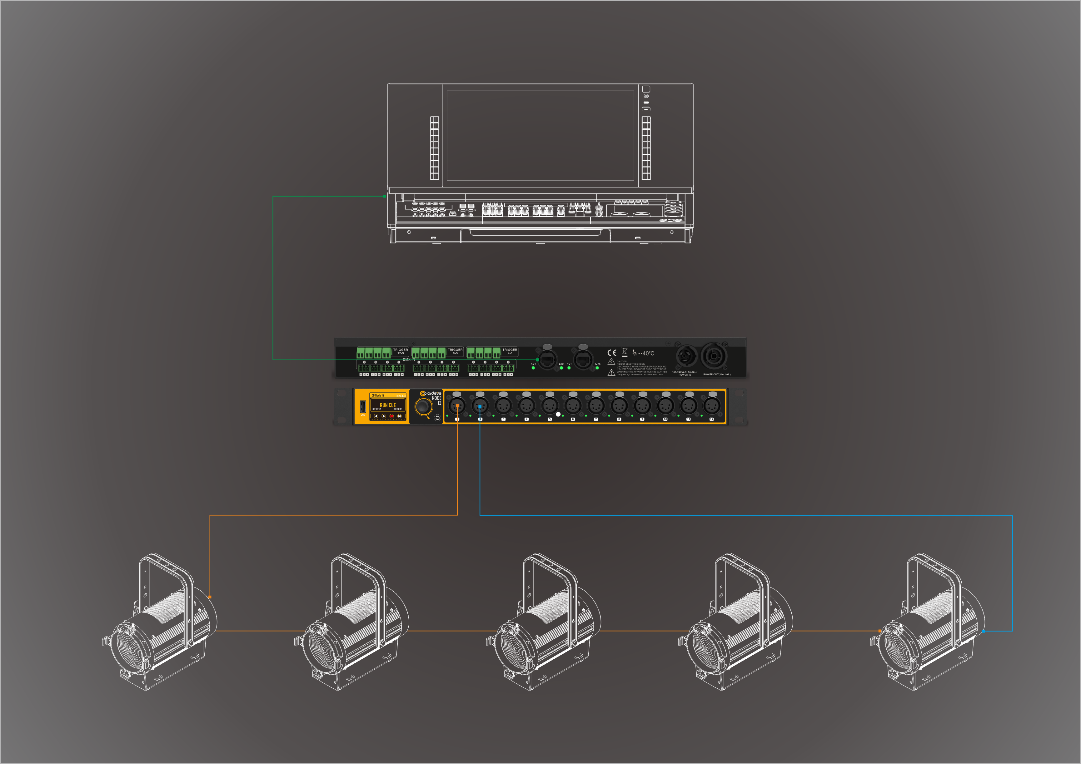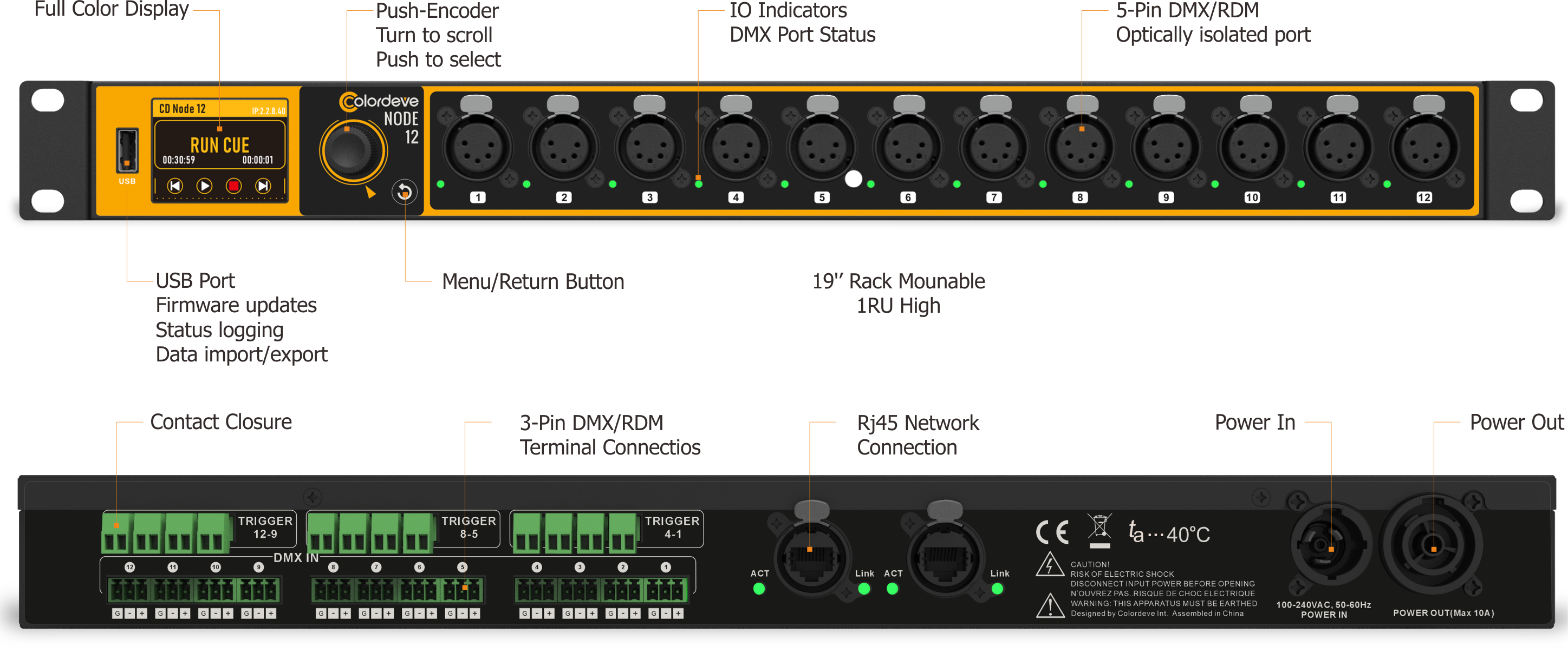 Featuring with 2x Ethercon interfaces, 12x 5-pin DMX ports, and 12x fixed terminals, the CD-Node12 offers flexible configuration in a rugged 19-inch package. Each port is fully optically isolated and can be independently set to input or output mode. The device supports industry-standard protocols like Art-Net and sACN, and its modular processing engine enables HTP, LTP, fading, backup, switching, and custom merging.