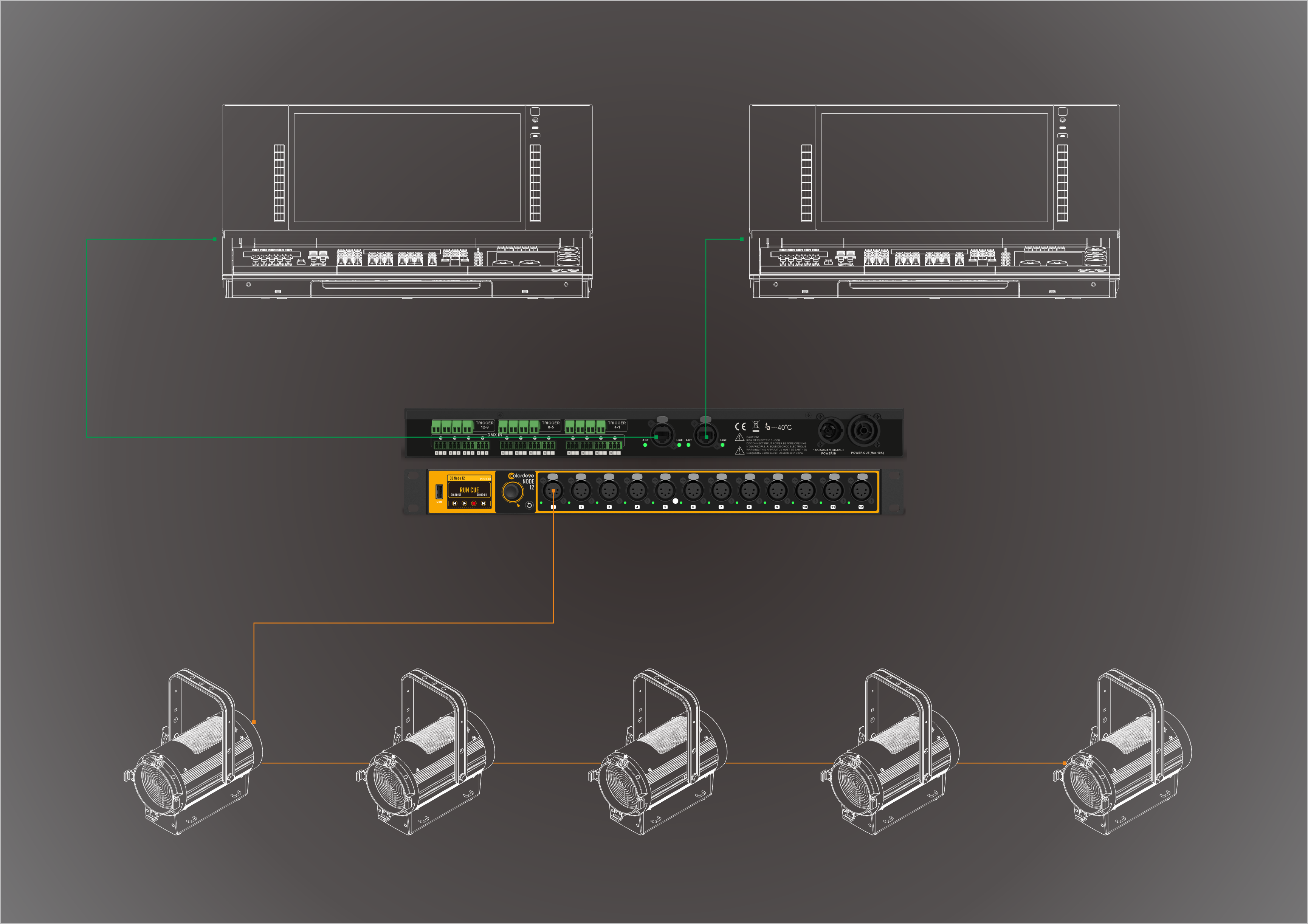 DMX Fallback enables fixtures on a single universe to be connected in a loop to two ports on the CD-Node for redundancy. If a single cable is broken anywhere in the DMX loop, all fixtures can still receive DMX.