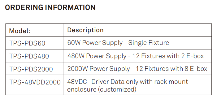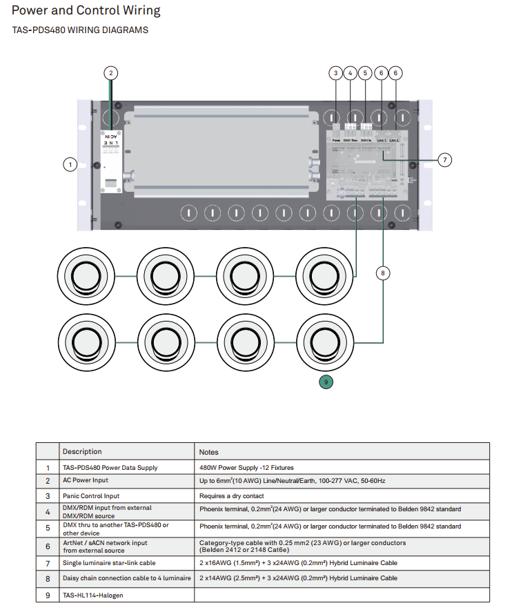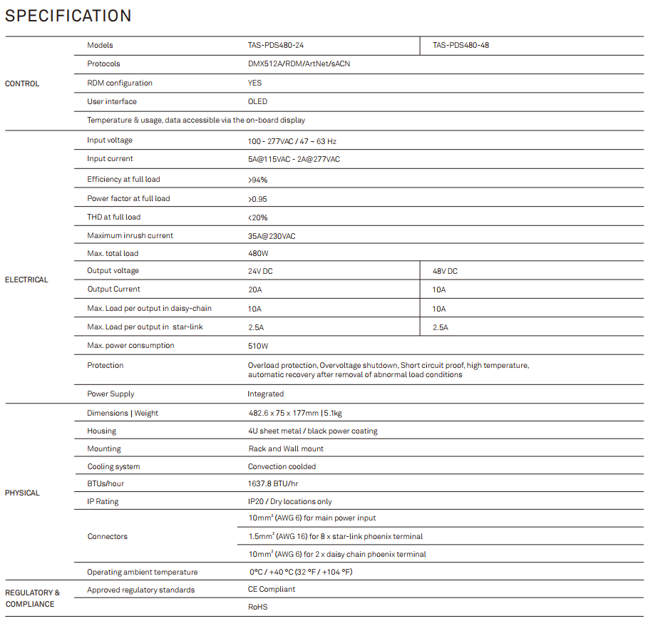 The TAS-PDS power data supply provides power and data for the TAS-HL114 Halogen LED fixture series. It supports input control protocols including DMX/RDM, sACN, and Art-Net, and features a 24V DC (48VDC optional) output. It utilizes a globally approved, premium PSU with a universal input range of 100-277VAC, making it suitable for nearly any application or location.